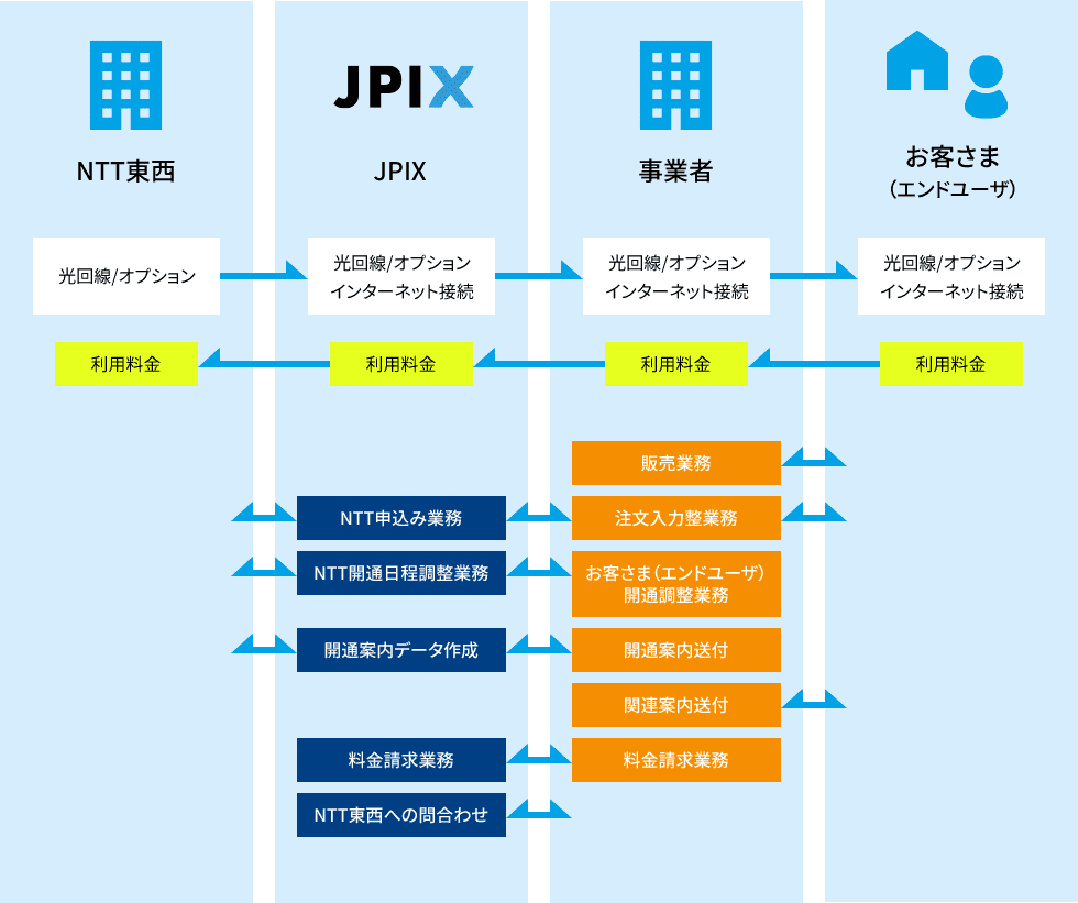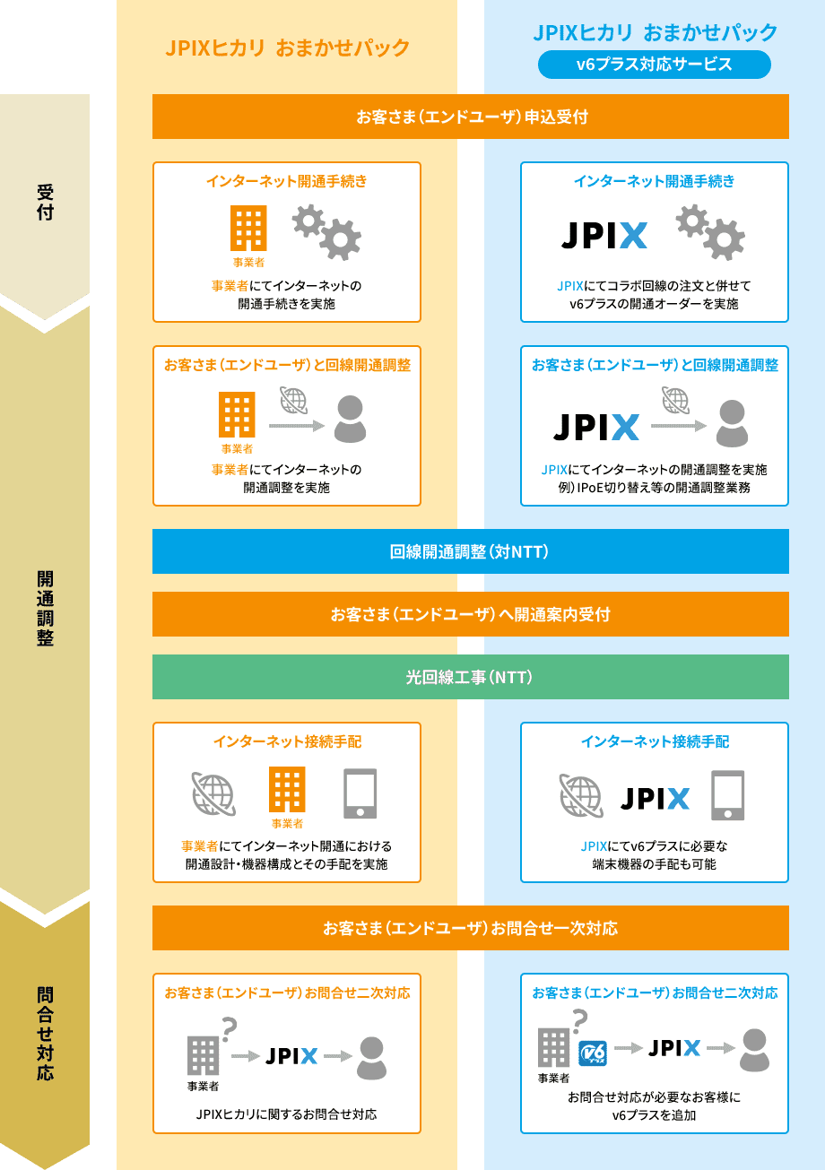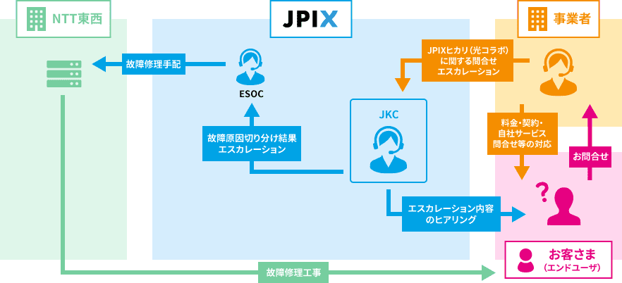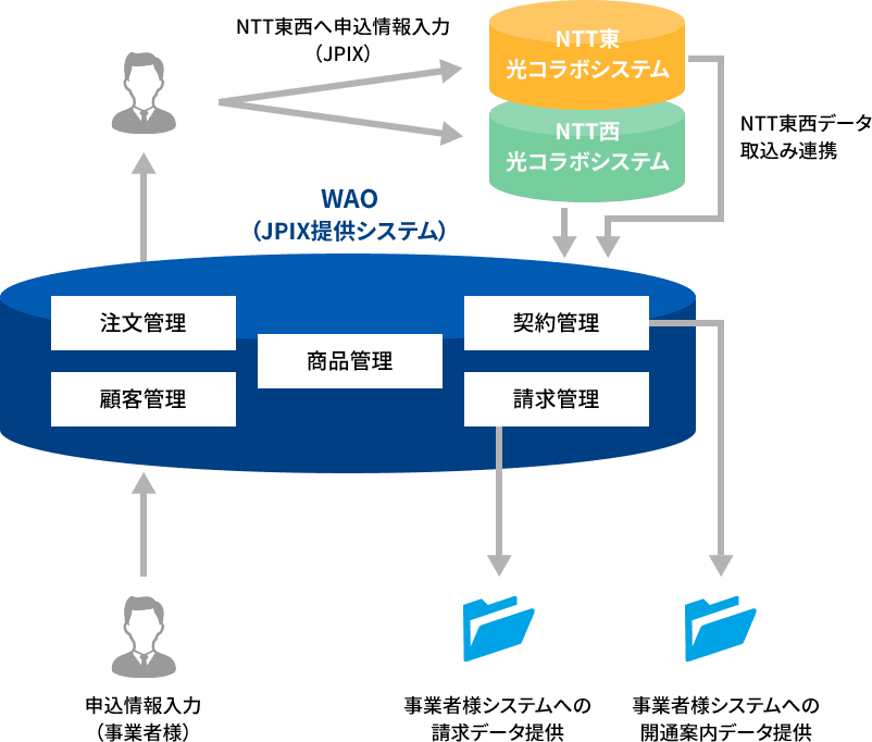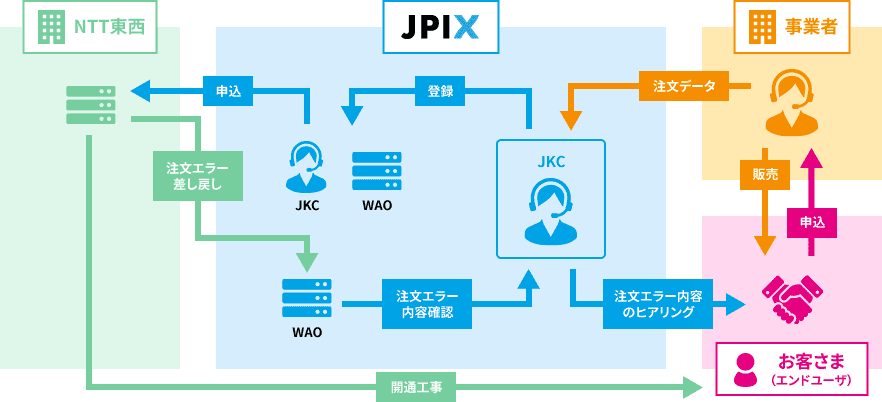 NTT東西の「光コラボレーションモデル」では東西別の受付システム、また、注文取次窓口は各エリアに複数存在します。「JPIXヒカリ」では「WAO」というシステムで東西エリアの注文受付・注文一元管理を対応。注文調整窓口として「JPIX開通センター」、故障保守の24時間365日対応一元窓口として「JPIXサービスオペレーションセンター」を提供します。両窓口にてNTT東西への注文業務・故障対応業務を実施します。