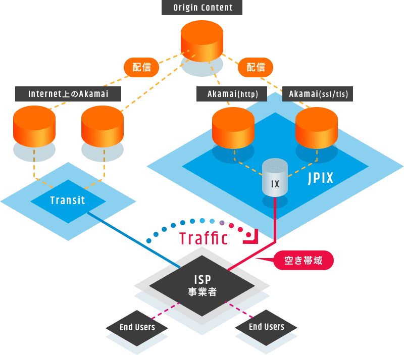 JPIX のサイトに設置されている Akamai Cache Server をISP事業者にご利用いただくサービスです。