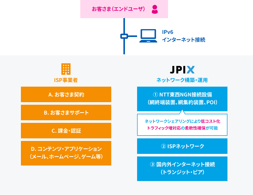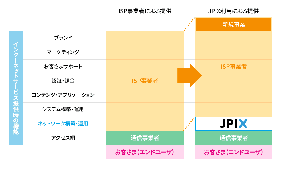 JPIXがネットワーク構築・運用を担当することで、ISP事業者は今まで以上にお客さま(エンドユーザ)へのサービスに注力することができ、新規サービス企画および営業開発に経営リソースを集中させることが可能となります。