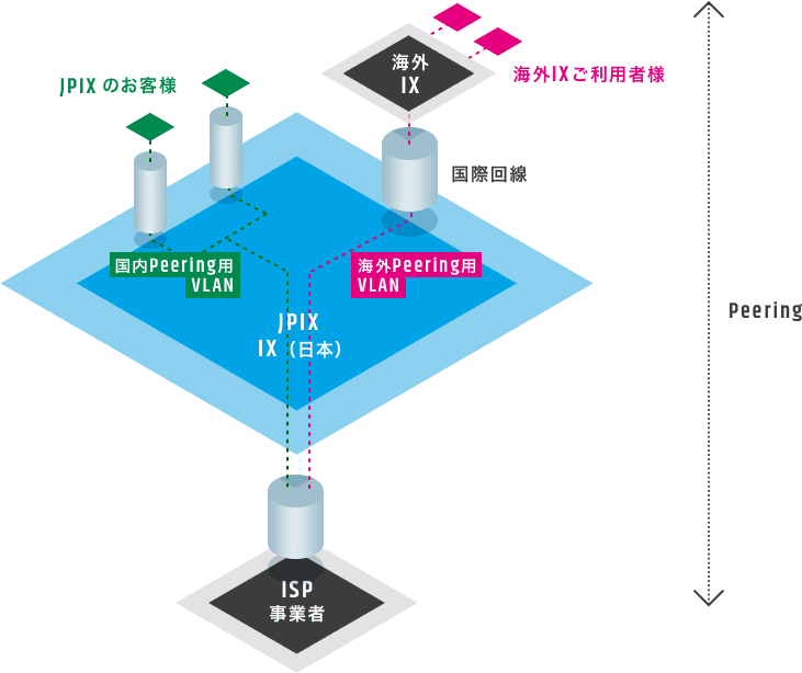 国内でIXポートサービスをご利用しているISP事業者が海外IXの利用者と Peering することが可能となるサービスです。