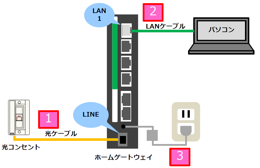 2. ホームゲートウェイの「LAN 1 ポート」とパソコンの「LANポート」をLANケーブルで接続します。
