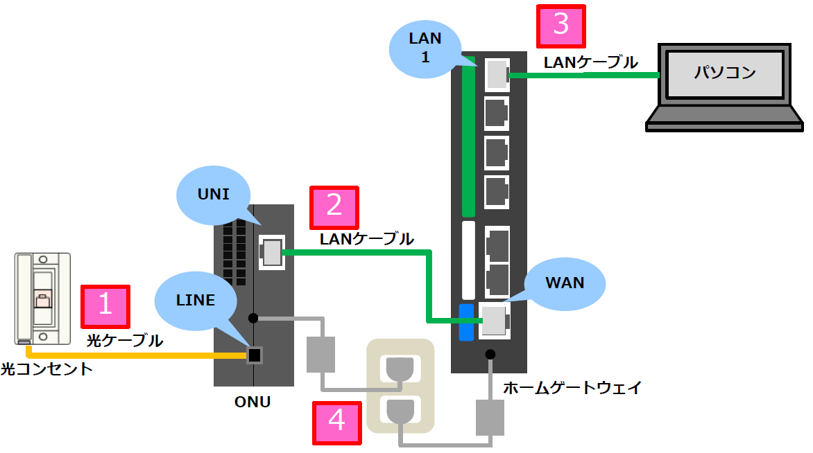 3. ホームゲートウェイの「LAN 1 ポート」とパソコンの「LANポート」をLANケーブルで接続します。