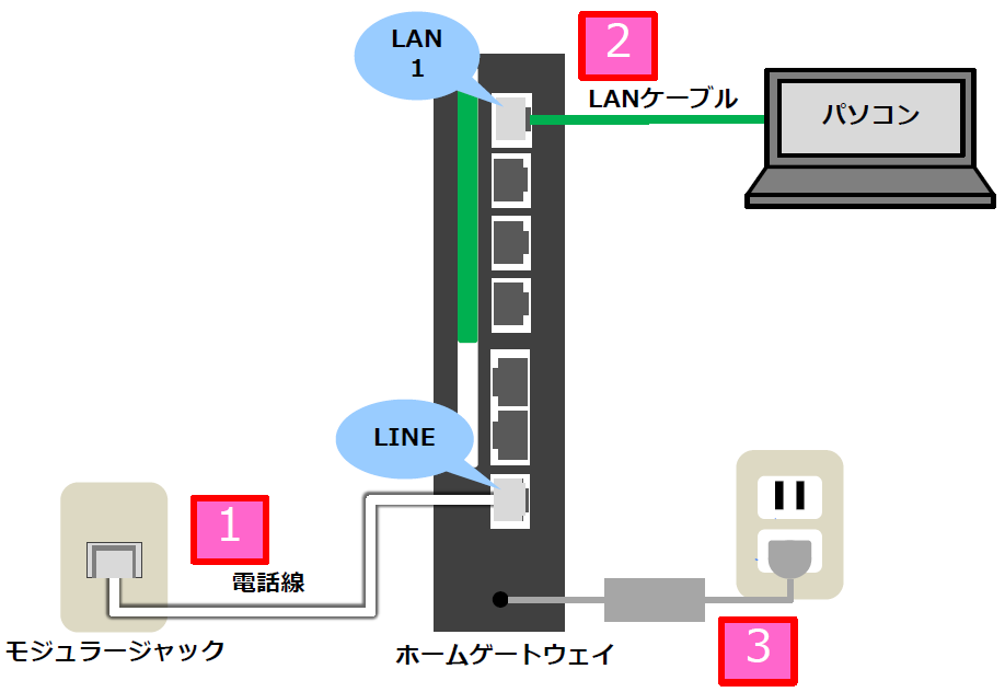 2. ホームゲートウェイの「LAN 1 ポート」とパソコンの「LANポート」をLANケーブルで接続します。