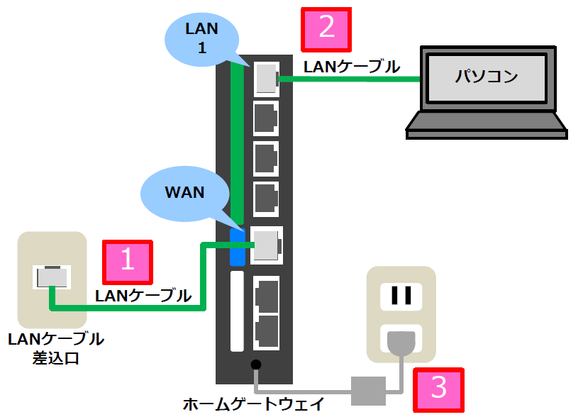 1. LANケーブル差込口とホームゲートウェイ「WANポート」をLANケーブルで接続します。