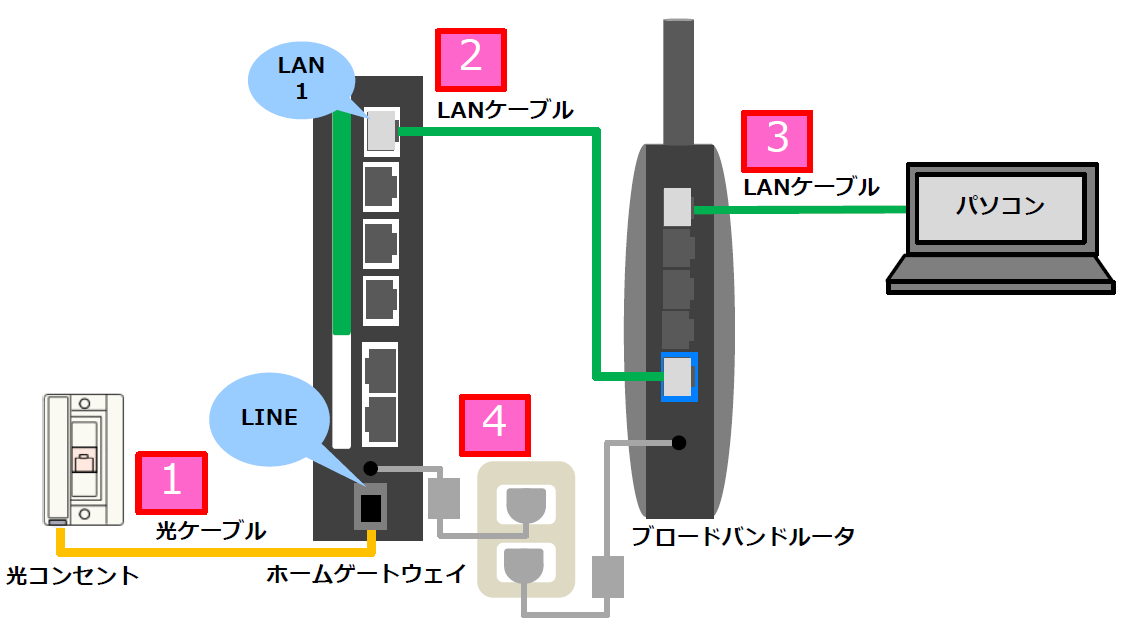- ホームゲートウェイの「LAN 1 ポート」とブロードバンドルータの「インターネットポート(青色)」をLANケーブルで接続します。