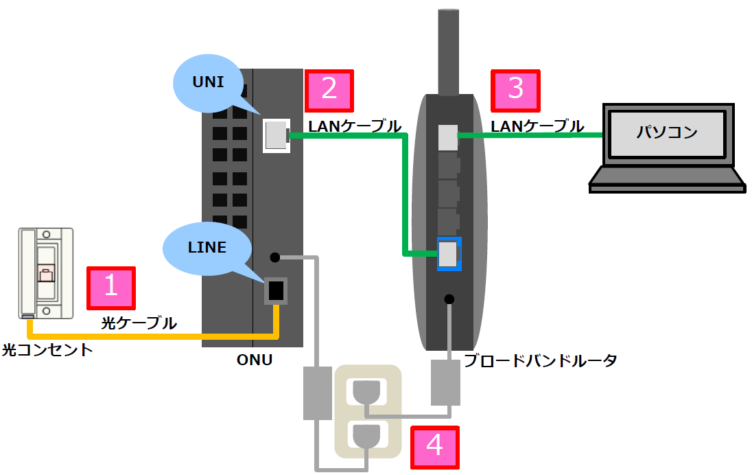 2. ONUの「UNIポート」とブロードバンドルータの「インターネットポート(青色)」を