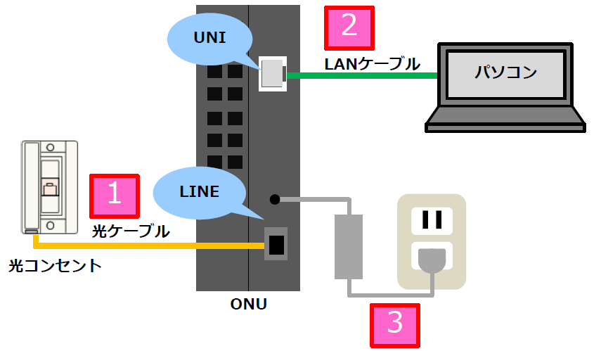 2. ONUの「UNIポート」とパソコンの「LANポート」をLANケーブルで接続します。