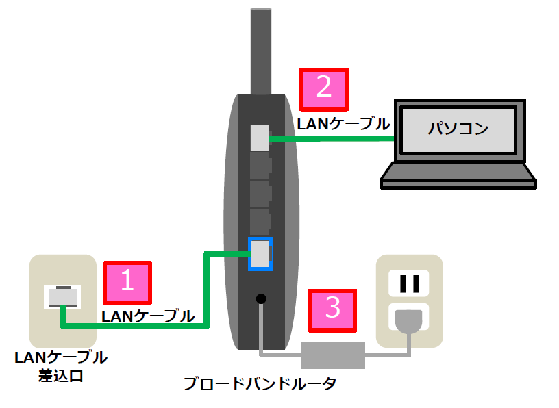 1. LANケーブル差込口とブロードバンドルータの「インターネットポート(青色)」を