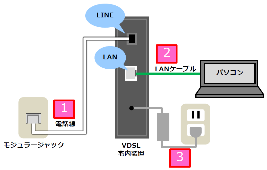 1. モジュラージャックとVDSL宅内装置の「LINEポート」を電話線で接続します。