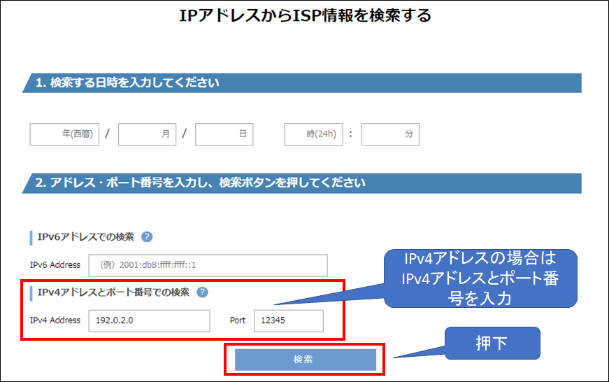 以下サイトへアクセスし、①でご確認いただいたIPアドレスより、プロバイダを確認します。